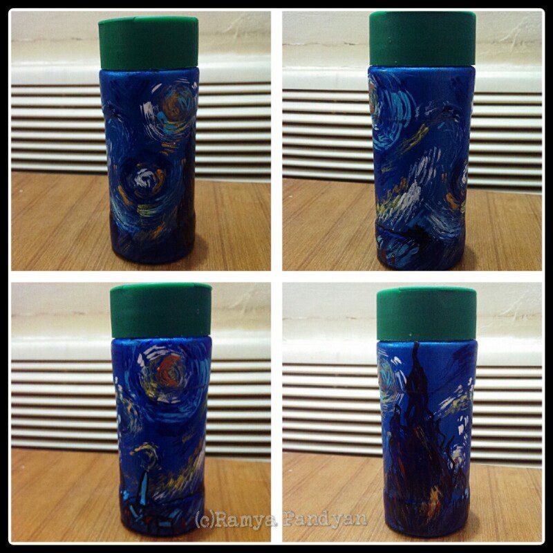 I’m only sorry I dared attempt to copy such a masterpiece onto a humble medium such as a glass bottle. That said, I’m not too unhappy with the result. Here’s my rendition of Vincent Van Gogh’s ‘Starry night’ on a lean glass bottle that originally contained oregano.
