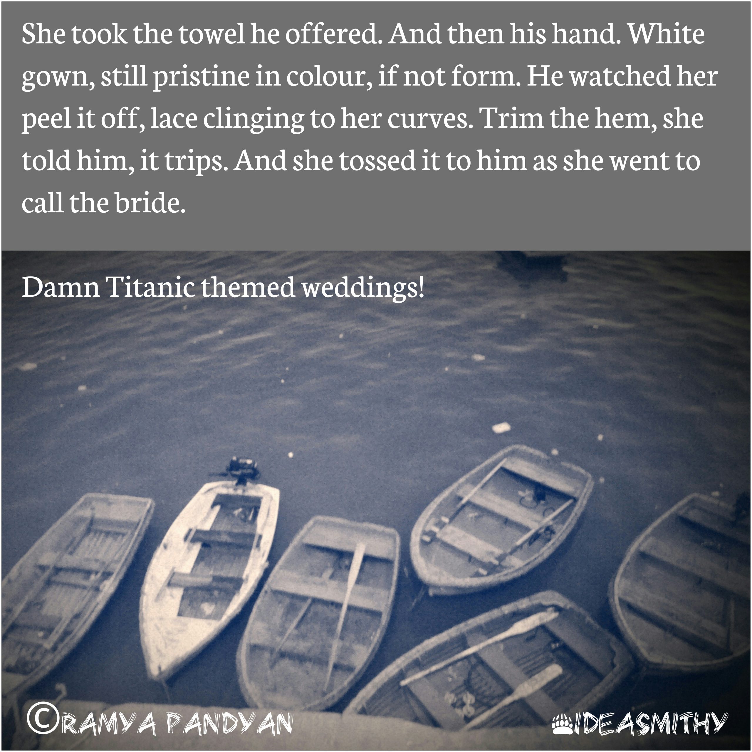 She took the towel he offered. And then his hand. White gown, still pristine in colour, if not form. He watched her peel it off, lace clinging to her curves. Trim the hem, she told him, it trips. And she tossed it to him as she wen to call the bride.